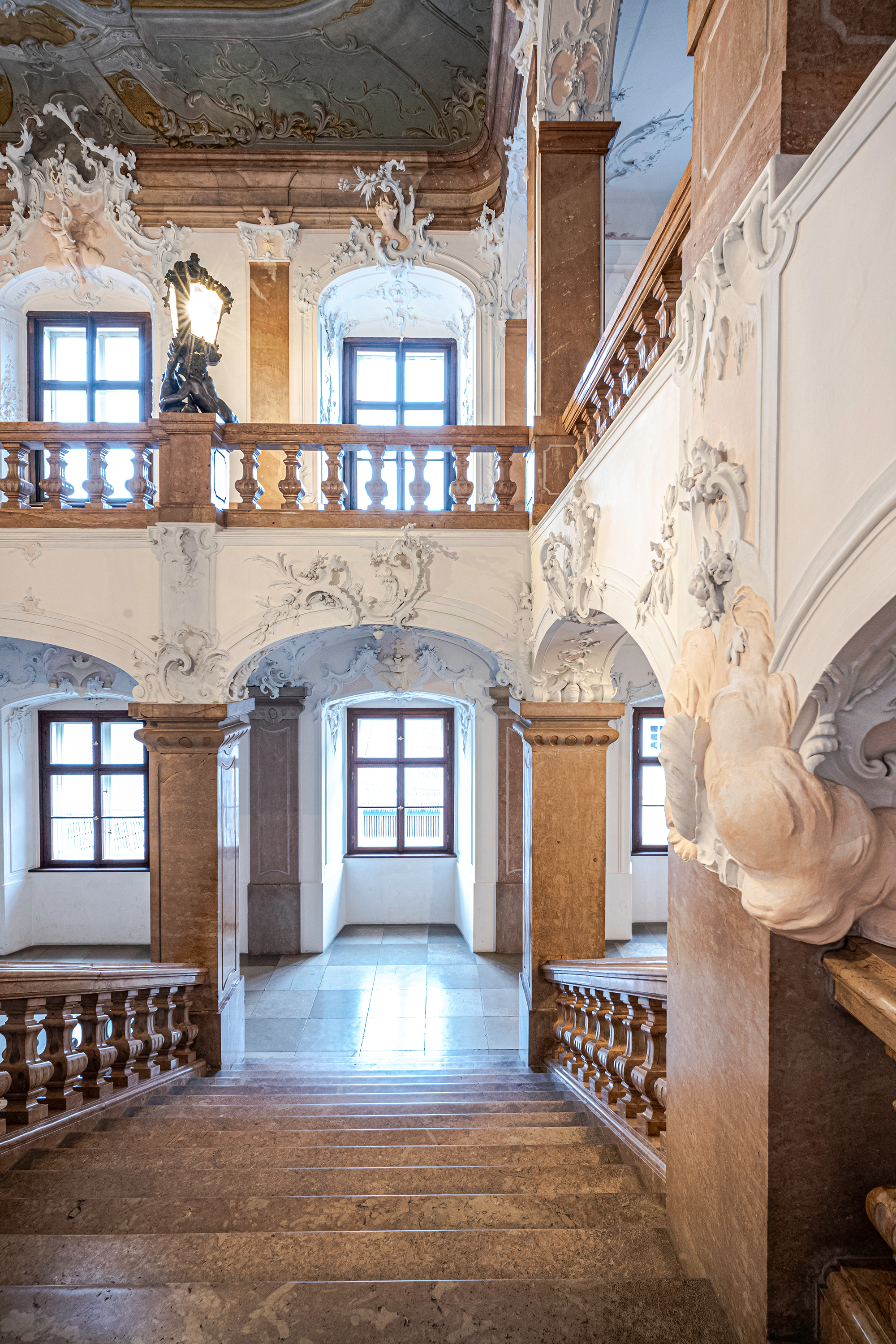 Die Neue Bischöfliche Residenz wurde bis 1730 im Wiener Spätbarock erbaut. Zwei Portalvorbauten und eine Dachbalustrade mit Figurenschmuck geben dem Bauwerk eine imposante Erscheinung. Das Stiegenhaus gilt als Glanzleistung des Rokokos. Der Stuckdekor ist erst zart, wird mit jedem Treppenabsatz üppiger. Man entdeckt Rocaillen und Blüten der Familie Modler. Bleierne Laternenputten sitzen auf dem Treppengeländer. Das Deckenfresko zeigt „Die Götter des Olymp beschützen das unvergängliche Passau“.