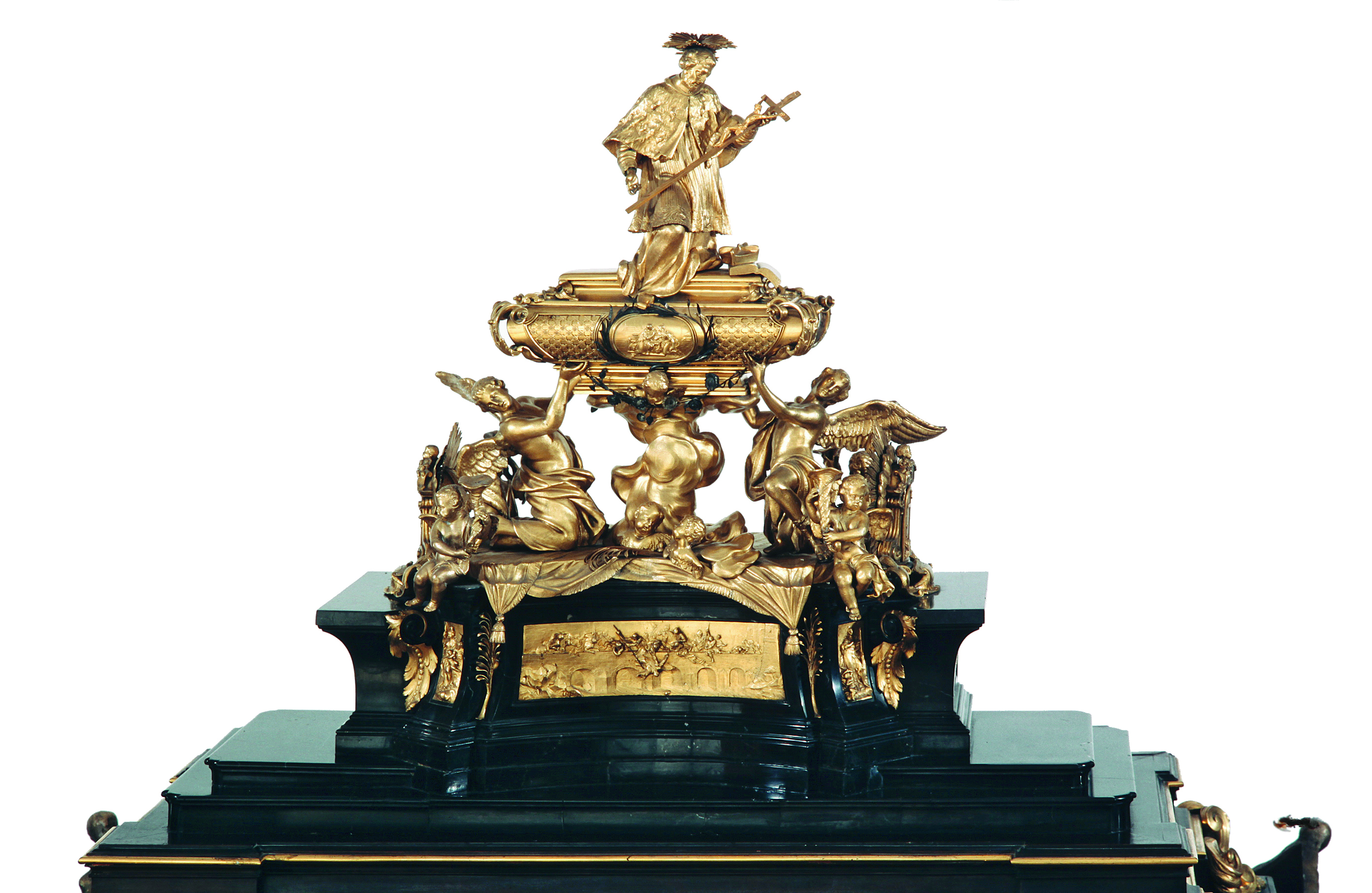 Den feinen Rokokostuck im prächtigen Treppenhaus der Neuen Residenz gestaltete 1768 Johann Baptist Modler. Das Deckengemälde des Paul Troger Schülers Johann Georg Unruhe zeigt den Himmel des Olymp, dessen Göttinnen und Götter das unvergängliche Passau schützen.