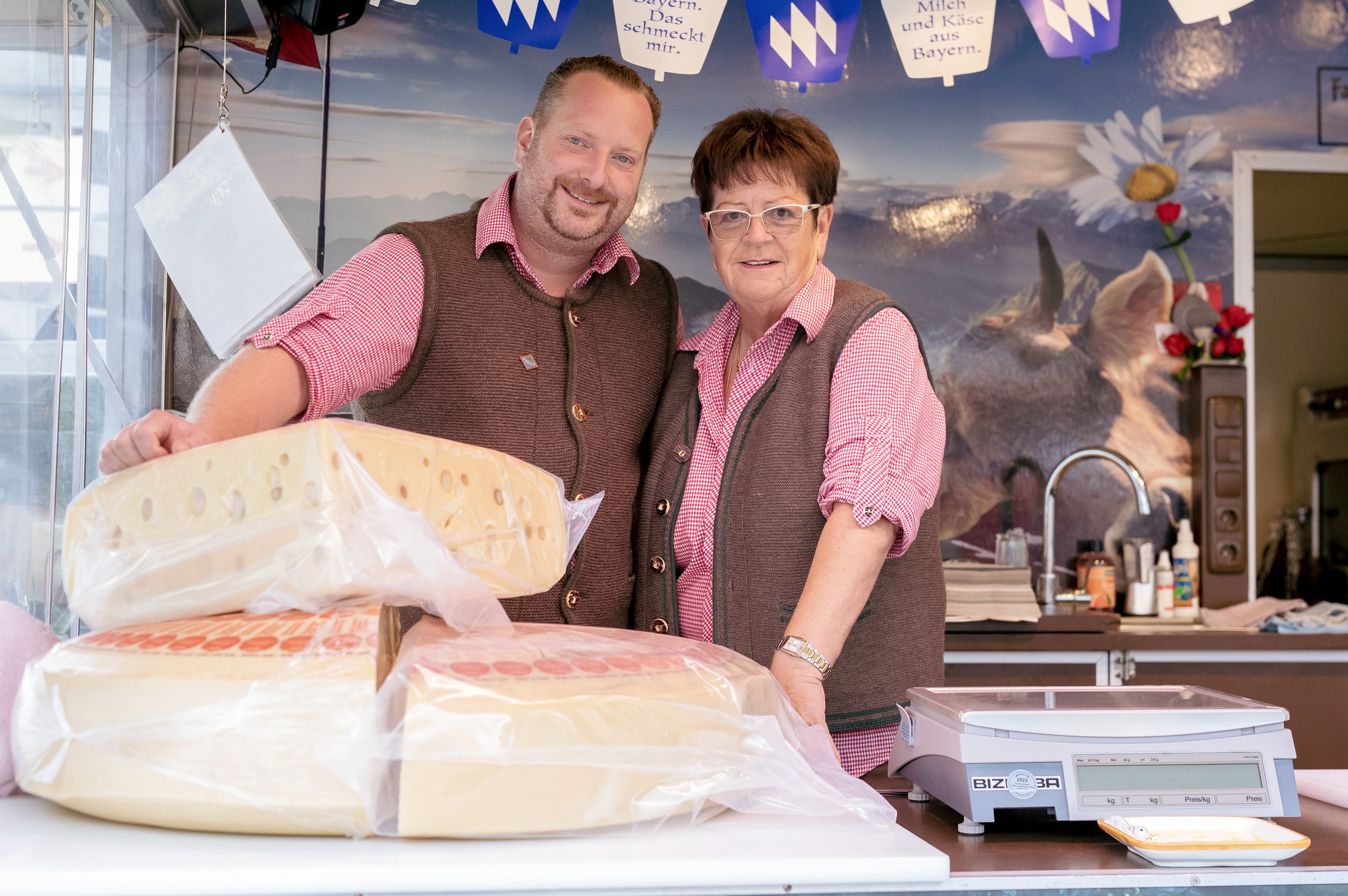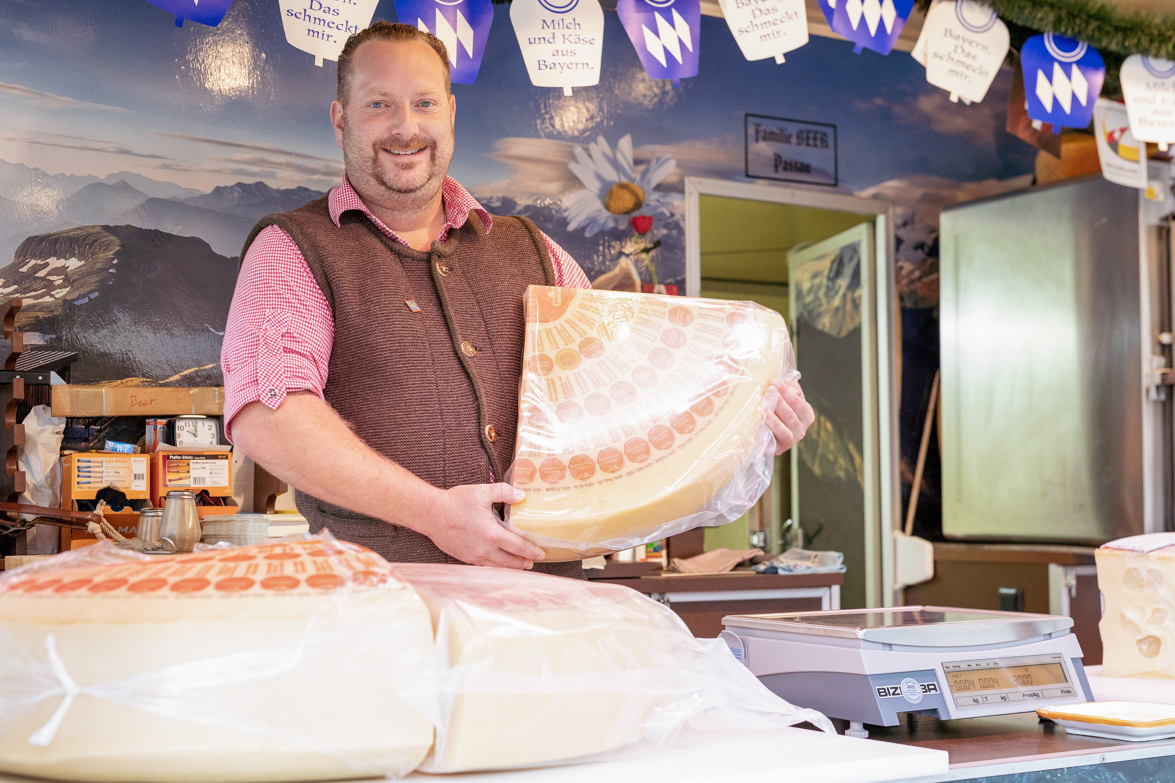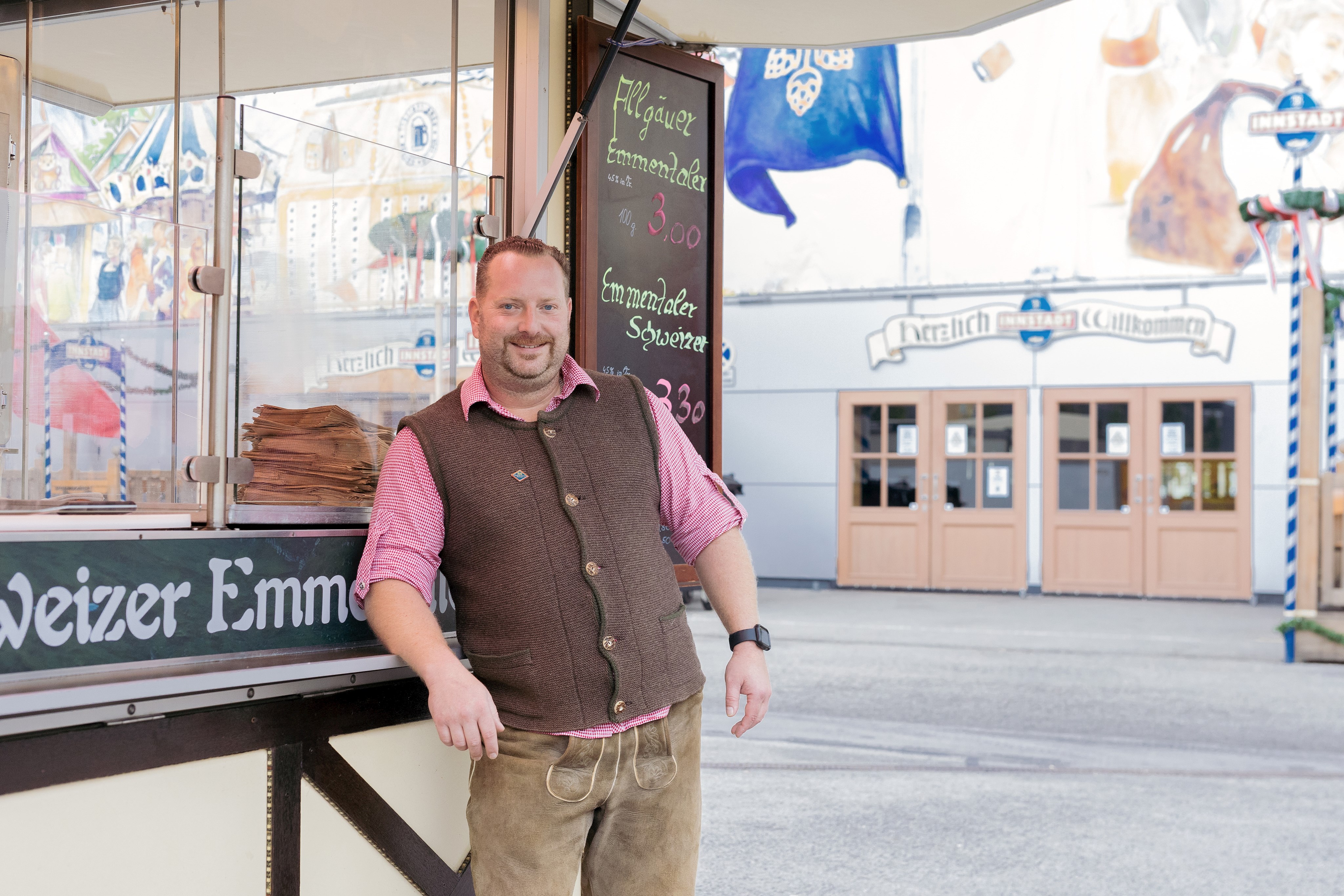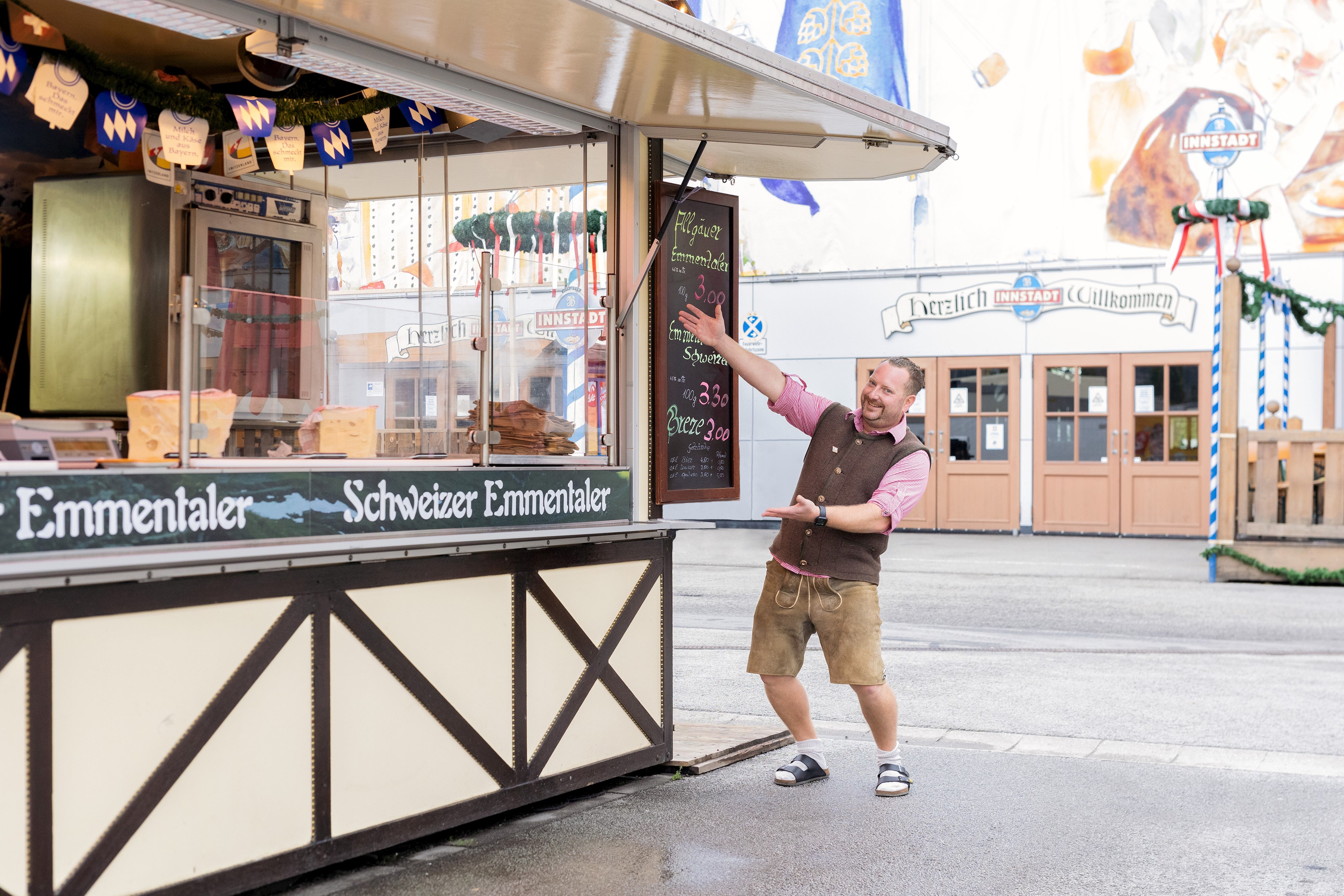 Es ist der vorletzte Tag auf der Dult und Armin Beer öffnet die Klappen der Verkaufsbude. Die großen Käselaibe hat er schon auf die Theke gelegt. Daneben steht die Waage. Von der Decke hängt eine Wimpelkette, blau-weiße Glocken mit Rautenmuster. Die Tafeln an den Außenseiten sind handbeschrieben in leuchtend Grün und Pink: Allgäuer und Schweizer Emmentaler, Breze, Getränke, dazu die Preise. Armin Beer betritt den Stand durch den kleinen Hinterraum. Er trägt ein rot-weiß kariertes Hemd, Strickjanker und Lederhose.