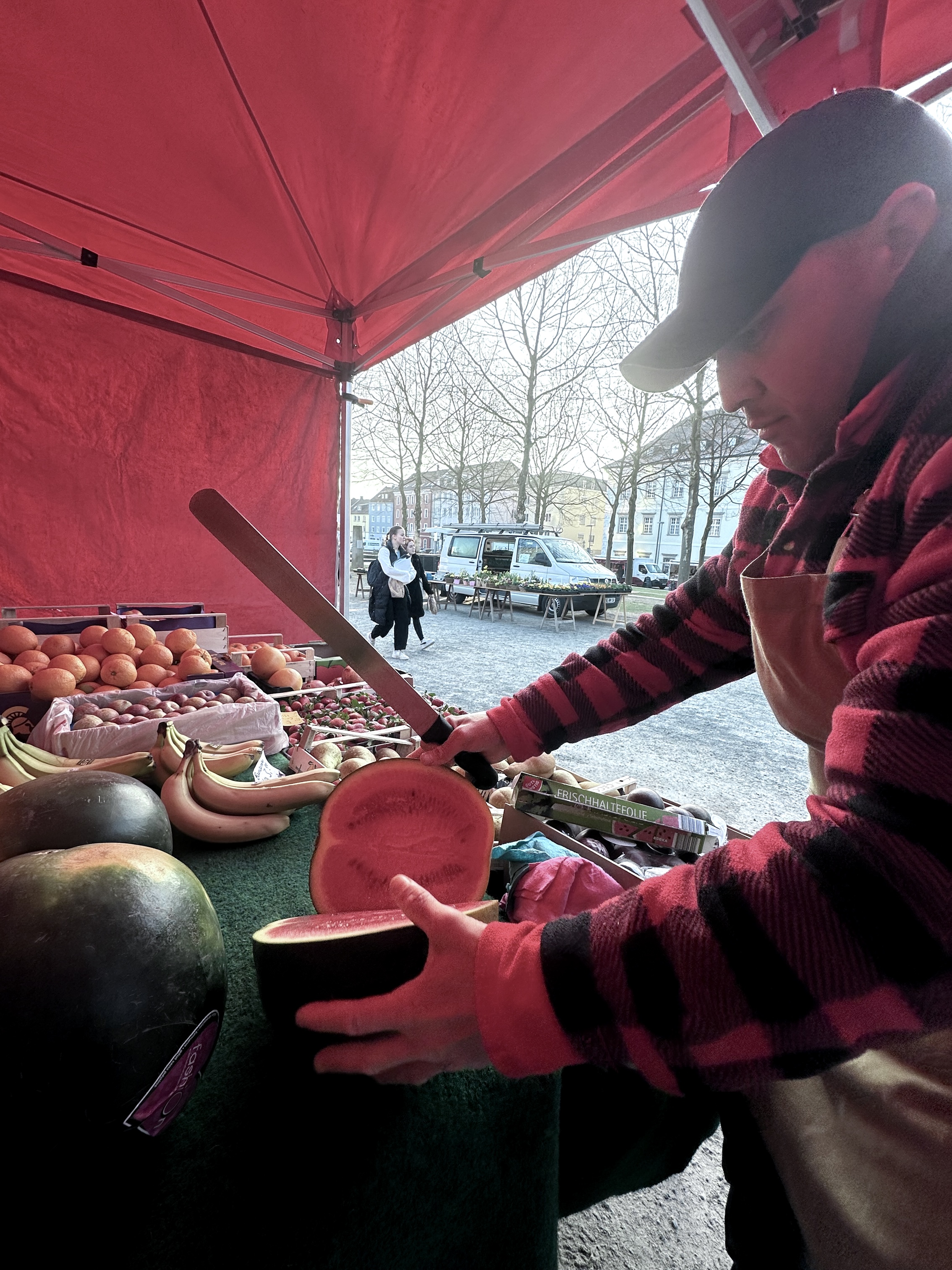 Ibrahim Cirkin schneidet eine Wassermelone in zwei Hälften und legt sie zu den anderen Obst- und Gemüsesorten an seinem Stand. Der ist so bunt, dass man sich fühlt wie auf einem Markt irgendwo im Süden. Orangen, Zitronen, Tomaten, ganze Artischocken, imposante krause Friséesalatköpfe: Ibrahim Cirkin – genannt „Ibu“ – holt die Ware donnerstags vom Großmarkt in München und verkauft sie freitags in Passau auf dem Wochenmarkt.