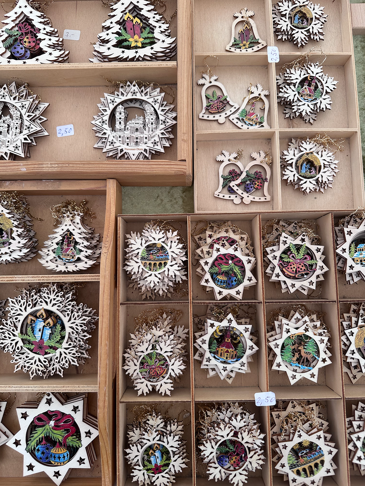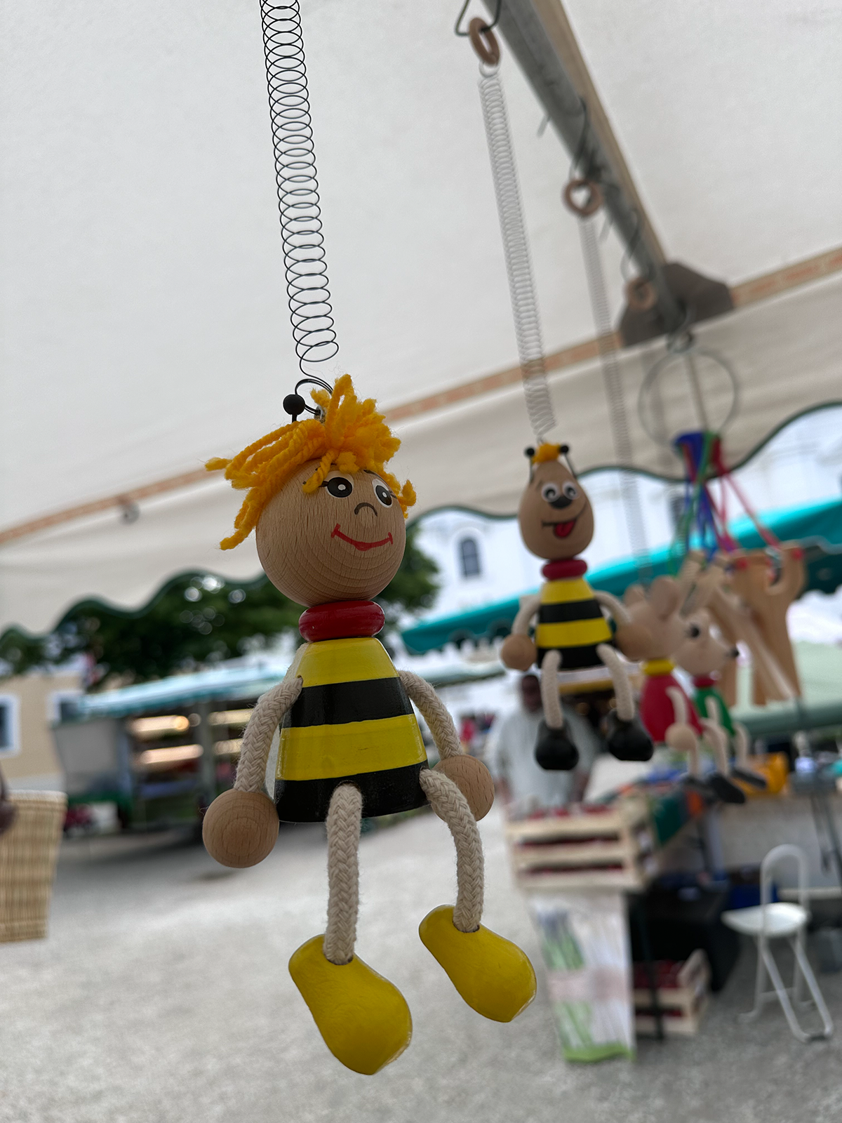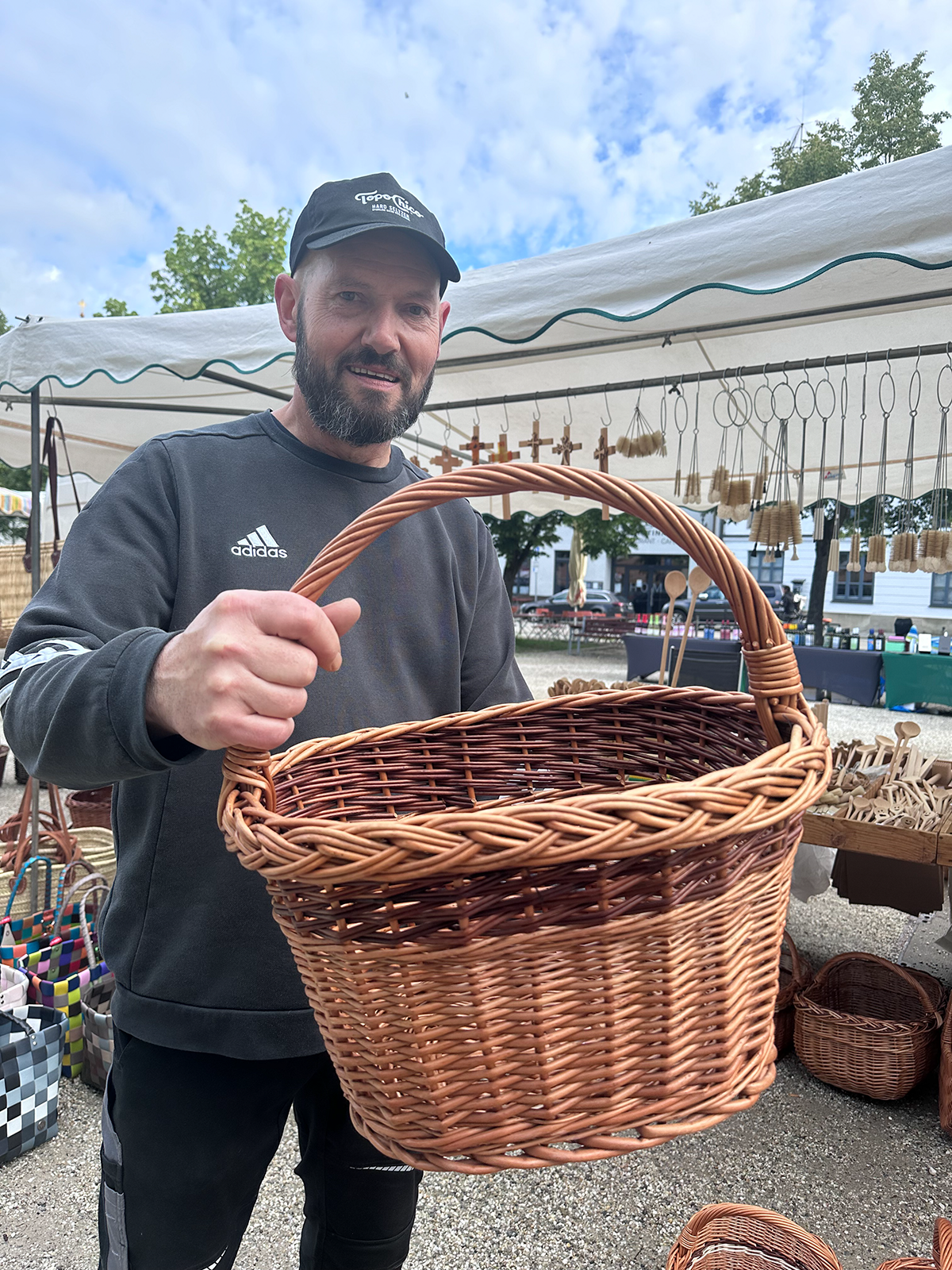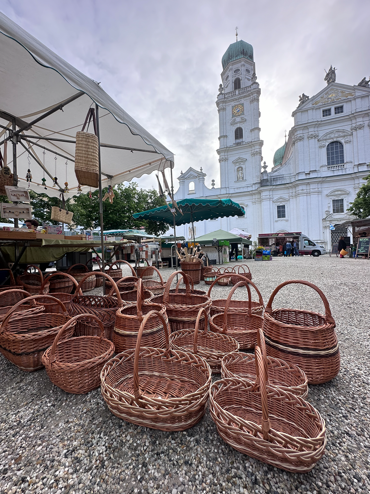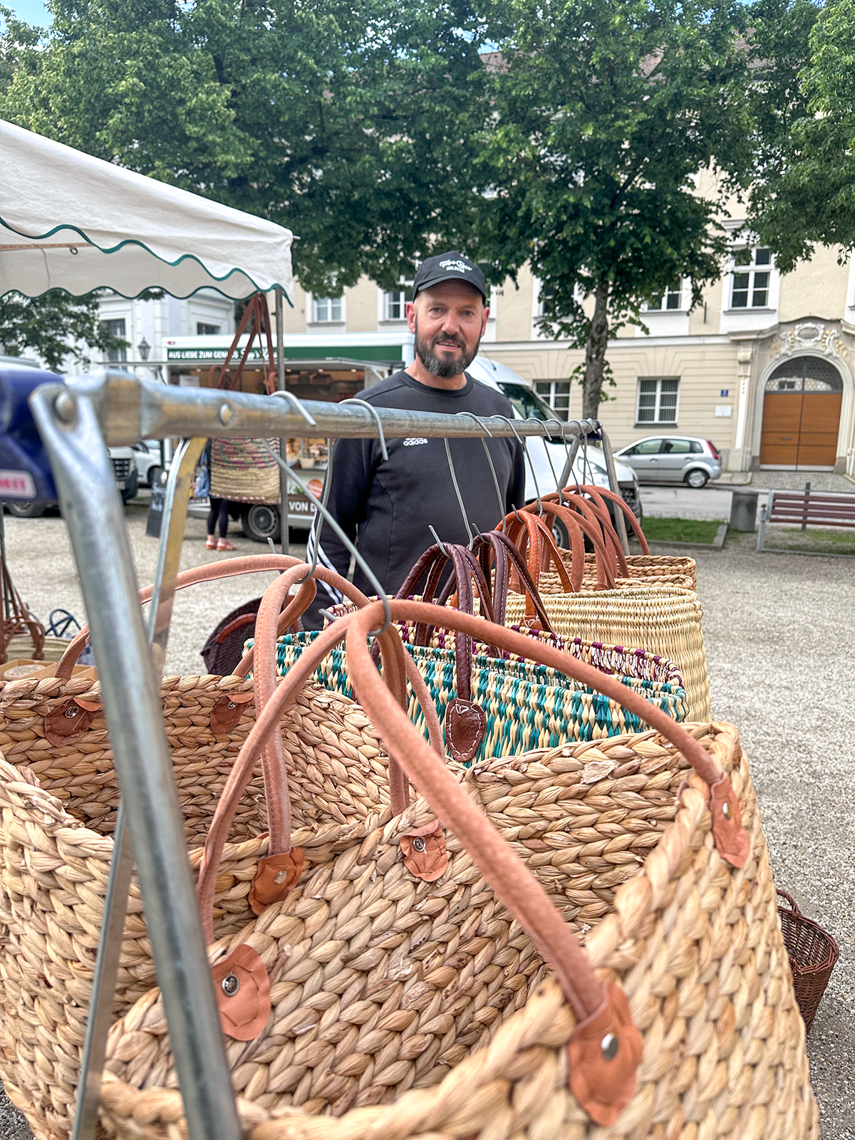 Joachim Heigenhauser bezieht sie aus der „Deutschen Korbstadt“ Lichtenfels. Weil auch viele Touristengruppen den Wochenmarkt am Domplatz besuchen, hat der Schöllnacher sein Sortiment angepasst und bietet alles aus Holz an, was auch im Reisekoffer verstaut werden kann: Kochlöffel, Geldschatullen, Bürsten, Figuren, Spielzeug-Flugzeuge, Kruzifixe oder Christbaumanhänger mit Passau-Motiv.