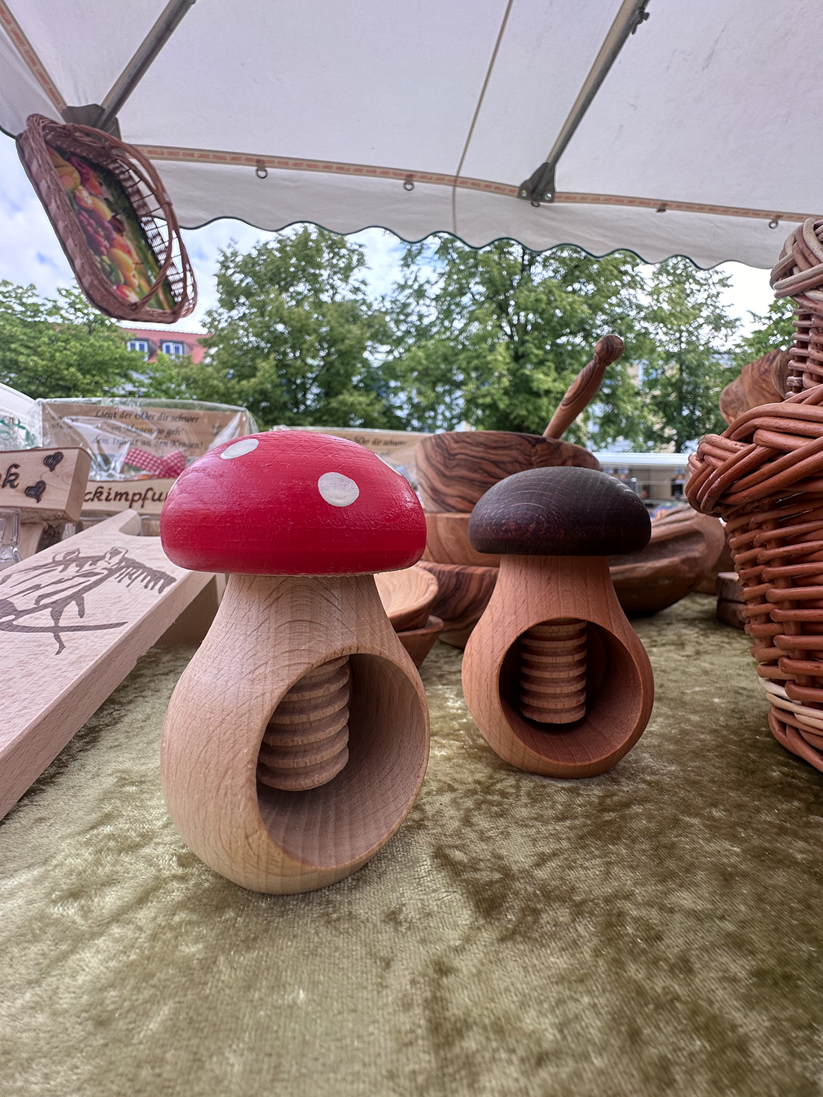 Der rot-weiß gepunktete Schwammerl, der ein Nussknacker ist, sticht ins Auge am Stand von Joachim Heigenhauser am Domplatz-Wochenmarkt. Den kleinen Fliegenpilz erblickt man aber erst, wenn man das Sortiment genauer betrachtet. Kommt man von weitem auf den Stand zu, sieht man vor allem eines: Körbe. Handgeflochtene Körbe und Naturtaschen, einfarbig, bunt, klein, groß.