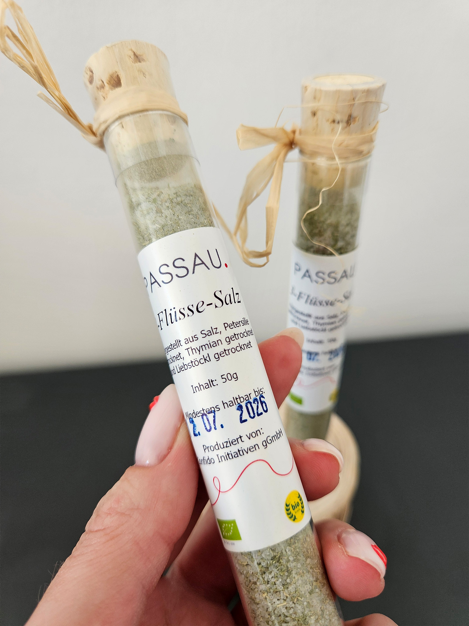 Aus Salz, Petersilie, Thymian und Liebstöckl wurde ein exklusives „3-Flüsse-Salz“ zusammengestellt, mit dem sich Speisen lecker verfeinern lassen. Das Salz im Reagenzglas kommt von „ConÖko - Soziale Landwirtschaft“. ConÖko gehört zur gemeinnützigen Gesellschaft "Confido-Initiativen", einer Initiative für traumatisierte Kinder und Jugendliche in Adlmörting bei Bad Griesbach.